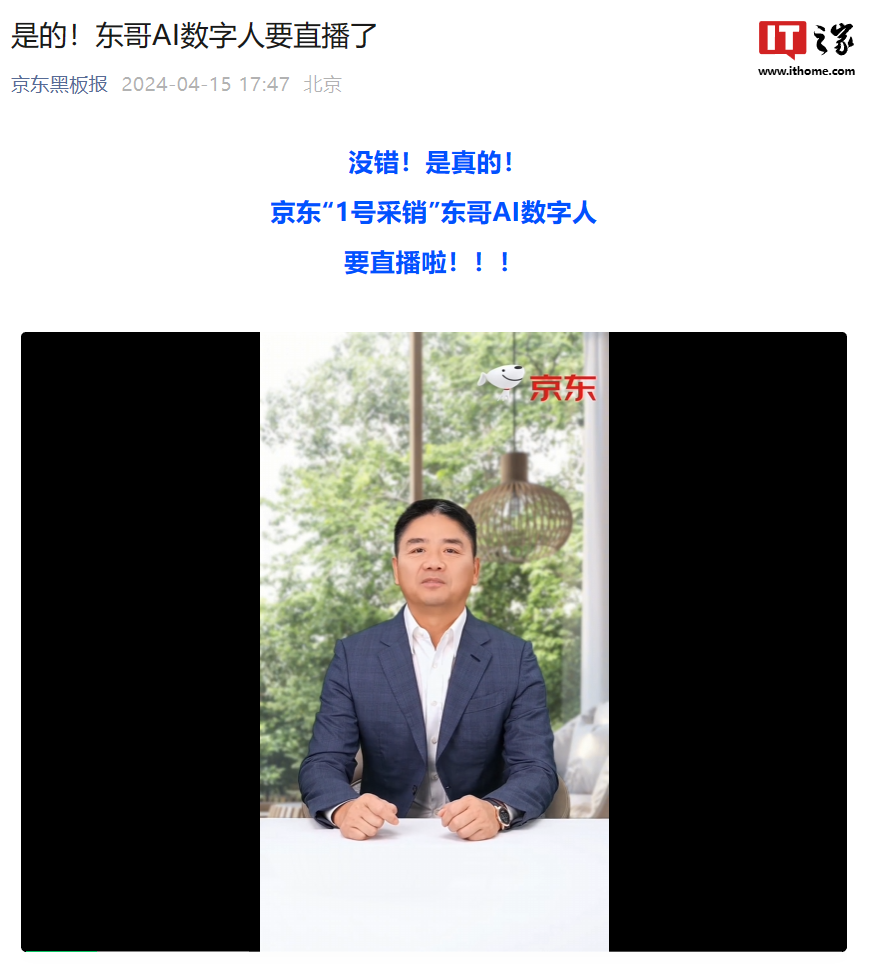 今年 4 月 16 日,劉強東 AI 數字人“採銷東哥”將於開啓“直播首秀”,同時亮相京東家電家居、京東超市採銷直播間。